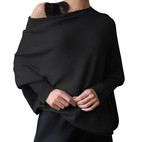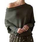 Ten sweter off-shoulder łączy kobiecą elegancję z przytulnym komfortem noszenia. Miękki materiał przyjemnie przylega do skóry i zapewnia ciepłe, przyjemne uczucie nawet w chłodne dni. Dzięki swojemu przewiewnemu krojowi i wyrafinowanemu designowi ramion, idealnie pasuje do dżinsów, spódnic lub legginsów. Wszechstronny ulubieniec do stylowych zimowych stylizacji.