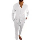 Męski komplet Hadrien łączy komfort i lekkość z codziennym stylem. Uszyty z przewiewnego materiału, zapewnia poczucie świeżości nawet w gorące dni. Zawiera polo z długim rękawem oraz dopasowane spodnie, co czyni go idealnym zarówno do swobodnego, jak i eleganckiego stylu. Jego uniwersalny design sprawia, że pasuje na luźne wyjścia, spacery po plaży czy eleganckie, casualowe spotkania. Komfortowy, elegancki i prosty w noszeniu, komplet Hadrien to niezbędnik w twojej garderobie.