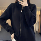 Kardigan z wełny Margaret dla kobiet z zamkiem oferuje idealne połączenie ciepła, komfortu i uniwersalnego stylu. Uszyty z miękkiej, wysokiej jakości wełny, zapewnia ciepło w chłodne dni, jednocześnie pozostając przewiewnym. Zamek na całej długości umożliwia łatwe dopasowanie do różnych stylizacji, od codziennych po bardziej eleganckie. Jego elegancki krój i szykowność czynią go niezbędnym elementem garderoby przez cały rok. Doskonały na pracę, weekendowe wyjścia lub odpoczynek w domu, ten kardigan łączy funkcjonalność z klasycznym stylem.